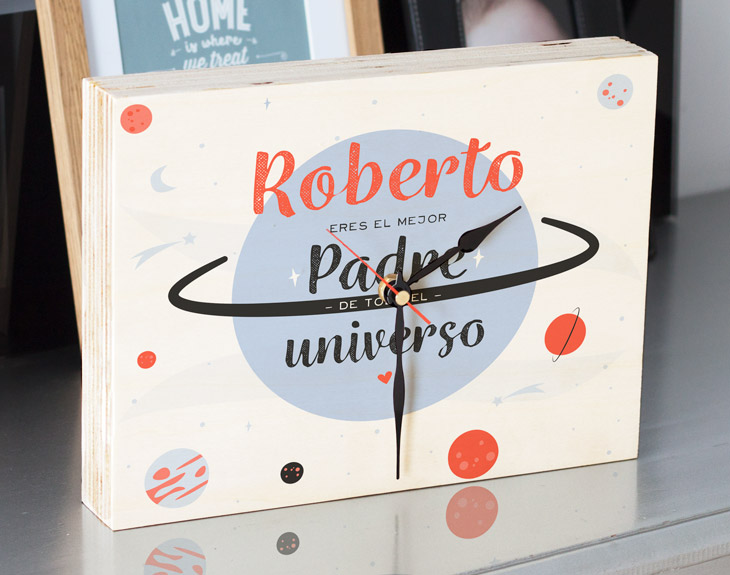 ¡Cada minuto es bueno para recordarle a tu padre que es el mejor del universo! Seguro que así le ayudarás pasar con alegría sus horas más duras. Ya sea que esté en el trabajo o en casa, dale esos ánimos tan especiales con este reloj personalizado. Seguro que le encanta el diseño de planetas y estrellas. Pero lo que más le gustará es este bonito mensaje que le podrás dedicar de forma totalmente exclusiva para él. Para ello, lo único que tienes que hacer es añadir el carrito y personalizarlo totalmente a tu medida. Escribe su nombre o ese apodo cariñoso con el que siempre le llamas y mira en la previsualización lo bien que quedará en nuestro diseño. Además, puedes escoger entre el reloj de pared o de mesa personalizado. ¡Como mejor se ajuste a su salón o su habitación! Sorpréndele con la mejor idea de un regalo original para el Día del Padre o para su cumpleaños. Algo que verá todos los días para recordarle a todas horas el buen padre que es. Tienes dos opciones de compra: Medidas reloj de pared: 49,5 x 30 cm. Medidas reloj de mesa: 27 x 20 cm. Importante: Las maderas tienen vetas y estas quedan reflejadas en la imagen. Instalación: el reloj de pared cuenta con agujeros en la parte posterior, hechos a medida por si quieres colgarlo utilizando tornillos, chinchetas, o lo que creas conveniente. ¡Cabrán perfectamente en los agujeros que vienen incluidos en la madera!