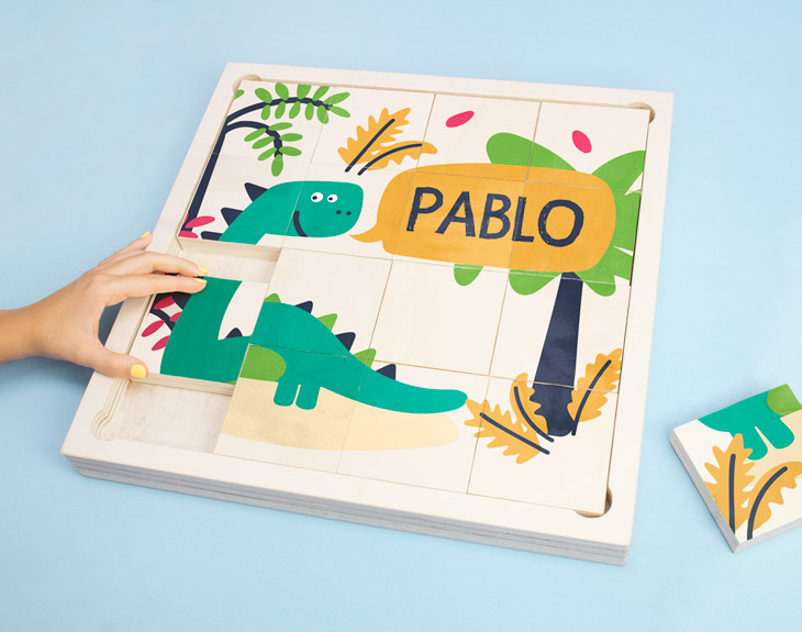 La mejor manera de enseñar a los más pequeños es jugando. ¡Así lo que aprendan se les quedará para siempre! Es hora de enseñarles a cuidar los muebles y no ensuciar la mesa cada vez que utilicen un vaso o su taza. Y lo podrás mientras jugáis a vuestro propio rompecabezas o puzzle de madera personalizado. ¡Rétale a formar la figura de este precioso dinosaurio y su hábitat natural! Con sus 16 piezas, este rompecabezas es totalmente accesible para niños/as pequeños/as. Todas las piezas tienen un grosor de 2cm para que las puedan sacar fácilmente. Así, cuando celebréis su cumpleaños, tendréis a mano un colorido pack de varios posavasos de madera con nombre. ¡Cada compañero tendrá una parte del mosaico con el nombre de tu hijo/a! Cuando todos tengan el suyo, aún podrás sacarle provecho al rompecabezas como bandeja de madera. Bien ancha y fácil de transportar con sujeciones a los lados para llevar todas las chuches y gominolas, ¡o la propia tarta de cumpleaños! Dimensiones de la bandeja: 39,7x39,7x4cm Número de posavasos: 16 Dimensiones de cada posavasos: 8,8x8,8x2cm Importante: Las maderas tienen vetas y estas quedan reflejadas en la imagen. Importante: si puedes tener reacción a cualquier tipo de alérgenos, puedes escribirnos para consultar si hay alguna opción alternativa.