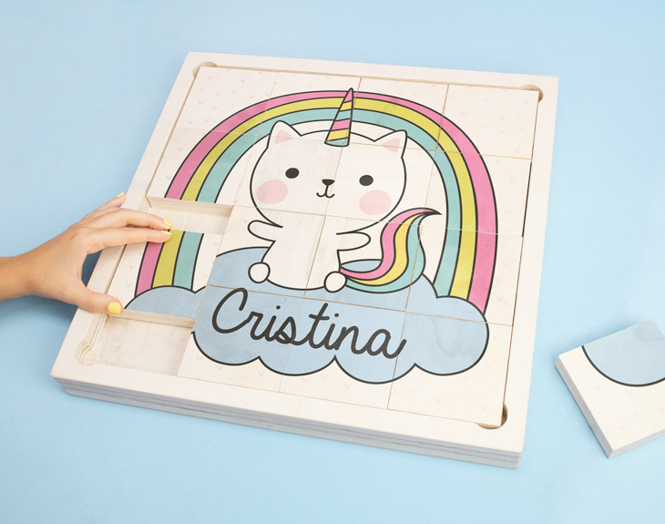 Te presentamos a nuestro gaticornio mágico. ¡La mezcla más mona de un gato con mofletes y un unicornio blanco con el cuerno de colores! Subido en su nube y gracias al poder de su precioso arcoíris, viene a descubrirte la magia de los múltiples usos en este producto original. En primer lugar, podrás utilizarlo como un rompecabezas o puzzle de madera personalizado. El gaticornio quiere saludar, ¡pero necesita que coloques en su lugar las 16 piezas de madera! Pero ojo, que no son solo meras piezas de puzzle. Si las separas, ¡tienes un pack de varios posavasos de madera con nombre esperándote! Enseña a los más pequeños de la casa a cuidar las superficies de las manchas con este original protector de vasos para mesas o cualquier superficie. Y cuando toque recoger, ¡aún queda entretenimiento resolviendo el puzzle del gaticornio! Incluso sin la forma del gato y tu nombre personalizado en la nube, aún quedan más usos. Sin las piezas, te quedará una bandeja de madera bien espaciosa. ¡Tú decides el uso que quieres darle! Dimensiones de la bandeja: 39,7x39,7x4cm Número de posavasos: 16 Dimensiones de cada posavasos: 8,8x8,8x2cm Importante: Las maderas tienen vetas y estas quedan reflejadas en la imagen.