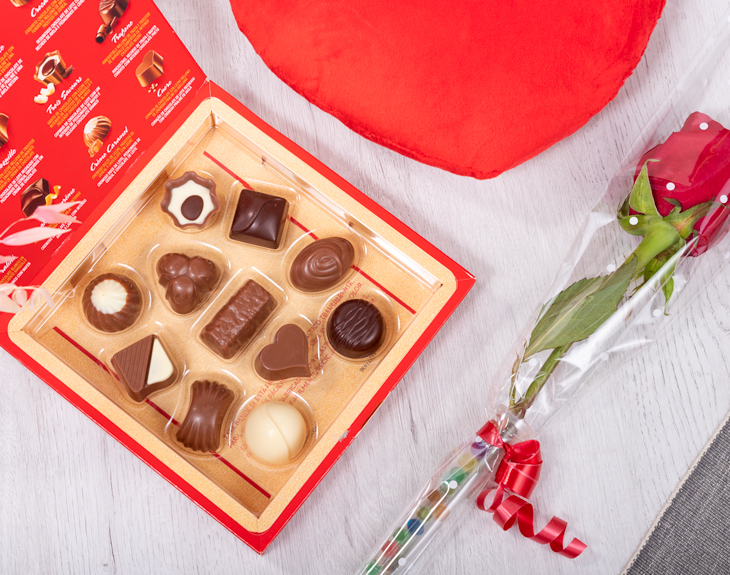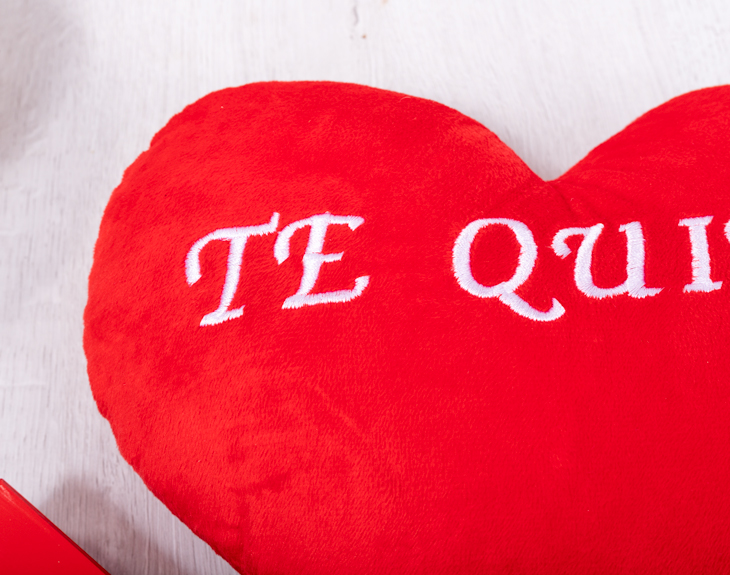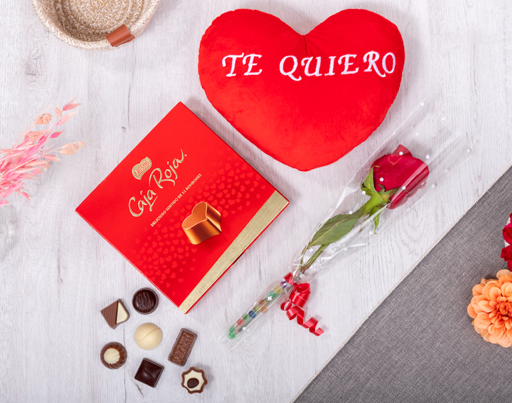 • Rosa. • Peluche corazón "Te quiero" 22 cm (voz opcional). • Bombones Nestle Caja Roja 100g. • Tarjeta Recordatoria.