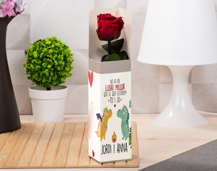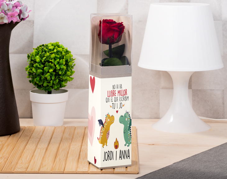 A lo largo de nuestra vida descubrimos muchísimas historias que nos conmueven y hacen que nos emocionemos continuamente. Los libros nos transportan a momentos y épocas que no conoceríamos de ninguna otra manera, a personajes que nos remueven y con los que nos podemos ver identificados. Todas esas historias están genial, pero no hay una historia más épica que vuestro amor. El día de Sant Jordi es el día perfecto para emocionar a tu pareja a través de la literatura y el romanticismo, gracias a una rosa eterna que nunca se marchite. Por eso contamos con una rosa disecada personalizada como esta, hecha para las parejas más formales y pasionales. Esta rosa con diseño para Sant Jordi es perfecta para todos esos romances duraderas. Podrás personalizar la etiqueta de esta rosa, una etiqueta que hace la declaración de amor más bonita que puede haber. Escoge los nombres que quieras para tu diseño y escríbelos en el área de personalización. La etiqueta de esta rosa será una dedicatoria preciosa para vuestro amor. Podrás escoger si quieres el diseño en catalán o en español. ¡El regalo original de Sant Jordi más especial! Medidas: 27 cm.