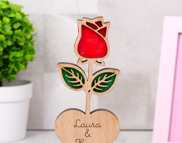 ¿Cuál es el mejor regalo posible para sorprender a alguien al que amas? Hay muchos detalles que dejarían a tu pareja con los ojos como platos y la boca abierta. Sí, seguro que te vienen a la mente algunos muy interesantes, pero no hay un regalo más clásico que unas bonitas flores. ¿Cuántas veces hemos visto en las películas un amor de cuento en el que se regalan unas preciosas flores? ¡Millones de veces! El único problema que tienen las flores es que, con el paso del tiempo, se marchitan. ¡Y está claro que vuestro amor es para toda la vida! Si quieres que la llama de la pasión siempre se mantenga viva, nosotros tenemos el producto perfecto para ti y tu pareja. Nuestra rosa de madera personalizada es el mejor regalo para los amores más románticos. ¡Viva el amor! Si regalas esta rosa con nombre, estarás dejando bien claro que el amor que sentís el uno por el otro es tan mágico que nunca se acabará. Este producto está hecho de madera, y quedará de lujo en cualquier rincón de tu casa. ¡Solo tendrás que decirnos el nombre de tu amado/a! Nosotros fabricaremos esta rosa con todo nuestro cariño para que esa personita tenga un regalo original único. Dimensiones: 21 cm de largo