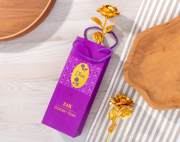 Si quieres profesar tu amor eterno no hay nada mejor que un regalo que dure para siempre. Nuestra rosa bañada en oro es ideal para sorprender a tu pareja o cualquier ser querido. El regalo perfecto de San Valentín para profesar tu amor a los cuatro vientos. La rosa está elaborada en polietileno, un material prácticamente eterno. Sobre él se ha suministrado una fina lámina de oro de 24 kilates, haciendo que sea un regalo elegante y diferente. Las rosas se elaboran una a una de manera artesanal: su fabricación requiere más de 4 días y hasta 65 pasos distintos. Por eso, no hay rosas iguales: cada pétalo, cada hoja y cada tallo son únicos. Además de la rosa colgaremos de su tallo unos corazones dorados de metacrilato con dos fotografías de tu elección para hacerlo aún más personal y único, también va acompañada de una cajita morada que podrás personalizar con el nombre de esa persona especial si así lo deseas. Este regalo original es un detalle increíble y elegante perfecto para las parejas más sólidas. Es estupenda para decorar cualquier rincón de la casa y que de un sólo vistazo se acuerden de ti. Datos técnicos: • Baño en oro de 24 kilates. • Dimensiones:25,5 x 8,5 centímetros.