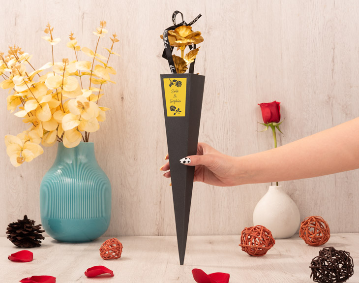• Rosa en cucurucho bañada en oro con texto. • Tarjeta Recordatoria.