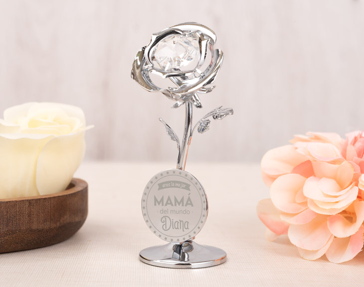 Las flores son el mejor regalo que le puedes hacer a la mejor mamá del mundo. ¡Te aseguramos que no encontrarás una flor más especial que esta rosa con cristales de Swarovski personalizada! Es un detalle hecho para esas mamás cuya belleza interior rivaliza con la de esta rosa, hecha de cristal. ¡Perfecta para sorprenderla en el Día de la Madre o en su cumpleaños! ¿No sabes con qué sorprender a mamá por esa ocasión tan especial? Esta rosa de cristal con diseño para mamá está hecha para las mamis más elegantes y refinadas. Al contar con una altura de 8,5 centímetros y un peso de 18,1 gramos, tu madre no tendrá problemas a la hora de colocarla en un rincón bonito de la casa. ¡Sus cristales de Swarovski hacen que sea todavía más bonita! Y es que al ser una rosa de cristal, te podemos garantizar que nunca se marchitará. ¡Este regalo original permanecerá con mamá durante toda la vida! Este producto irá con un precioso diseño personalizado grabado en la parte frontal. ¡Tú podrás crearlo! En el diseñador encontrarás la plantilla de este diseño, a la que solo le tendrás que añadir el nombre de la mejor mamá. Nosotros nos ocuparemos de grabar este diseño en la rosa. ¡Mamá se quedará con la boca abierta al ver una rosa tan bella como ella! Datos técnicos: • Peso: 18,1 gramos. • Dimensiones: 8,5 x 3 centímetros. Material: metal prensados en frío con acero y galvanizados.