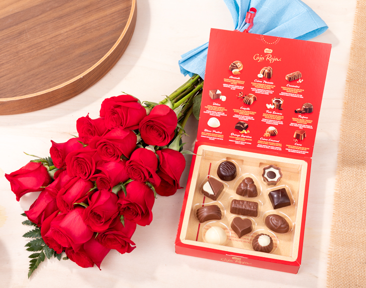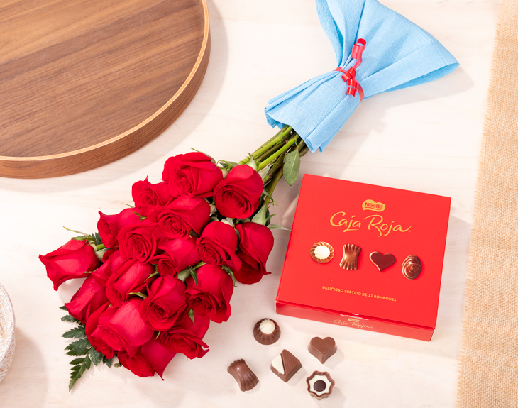 Regala un precioso ramo de rosas recién preparadas junto con una caja de deliciosos bombones Nestlé Caja Roja. Un regalo clásico, que nunca pasa de moda y que siempre llega al corazón de esa persona especial.