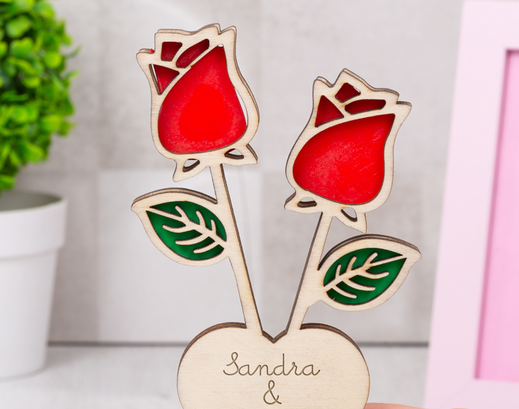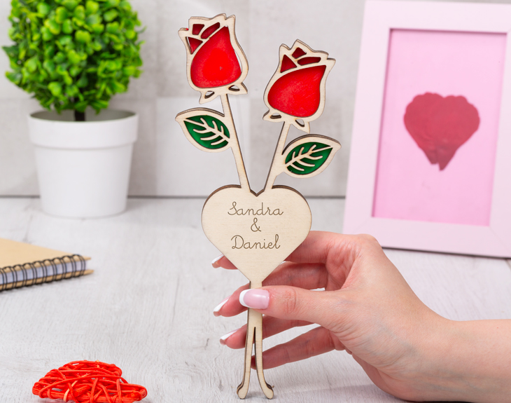 ¡Ha llegado el momento de festejar vuestro amor! Los aniversarios son celebraciones muy importantes para todos. Fue el momento en el que te comenzaste a enamorar de la persona que más quieres, de esa persona sin la que no puedes vivir a día de hoy. ¡Estamos hablando del amor de tu vida! Tener a alguien que te quiera de manera incondicional es algo precioso y único. Por eso hay que luchar por mantener la llama, por sorprender a nuestra media naranja cada día. ¿Y por qué no hacerlo con estas rosas de madera personalizadas? ¡Regálale una flor a otra flor! Estas rosas con nombre están hechas para las parejas más bonitas, para aquellas que planean estar toda la vida juntas. Simboliza vuestro amor con este regalo original, hecho de madera y acetato. Solo tendrás que escribir vuestros nombres en el diseñador y nosotros nos ocuparemos de todo. ¡Quedará un regalo flipante y romántico! Dimensiones: 18 cm de largo