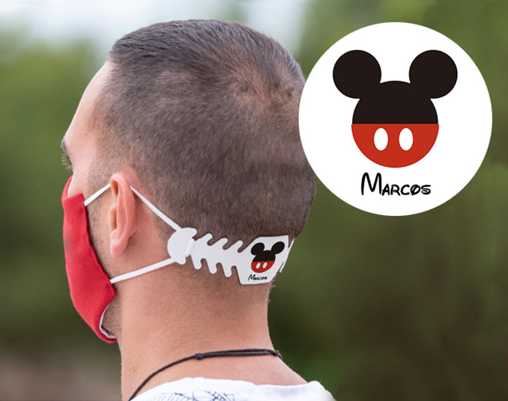 • Salvaorejas para mascarillas. • Tarjeta recordatoria. Los salvaorejas han surgido en los últimos tiempos como una solución para solventar uno de los problemas más molestos del uso de mascarillas: el dolor de orejas. Seguro que sois muchos los que al final del día os encontráis con vuestros delicados oídos enrojecidos y doloridos por el roce constante de las gomas, pues bien, los salvaorejas van a borrar todas esas molestias de un plumazo, ya que están pensados para sujetar en ellos las gomas de las mascarillas, evitando así el roce con nuestras orejas. Quién lo prueba una vez, no quiere dejar de usarlo. Si a la ventaja que nos da usar un salvaorejas, añadimos un diseño cuidado y personalizado, conseguiremos hacernos con un detalle de lo más especial con el que sorprender a vuestra pareja, hijo o familiar. Eso es lo que tenemos si nos decantamos por este precioso salvaorejas para mascarilla Mickey y Minnie. A la hora de personalizarlo, podremos elegir entre cuatro dibujos: las siluetas de Minnie en tamaño grande y pequeño, y las siluetas de Mickey en tamaño grande y pequeño. Las pequeñas están pensadas para representar a los niños y las grandes para los adultos. De esta manera, si queremos hacernos con un salvaorejas para toda la familia, podremos diferenciarlos por su tamaño, además de por el nombre impreso. Su diseño minimalista, es muy elegante y hará que consigamos un regalo fino y apto para todo tipo de edades y personas. El diseño, por otro lado, se puede completar con el nombre de la persona escrito en la famosa tipografía de Disney. Este salvaorejas está fabricado en un flexible y resistente plástico blanco que se adapta a todo tipo de formas y medidas. Es apto, por tanto, para niños y adultos y no se debilitará con el tiempo. Puede que a simple vista un salvaorejas no parezca un regalo espectacular pero lo cierto es que es un detalle tan práctico y con un diseño tan bonito que encaja perfectamente en cualquier ocasión. Si se acerca el cumple de tu chica y quieres sorprenderla con un pack de salvaorejas Mickey y Minnie a juego, seguro que le encantará este precioso detalle con vuestros nombres.