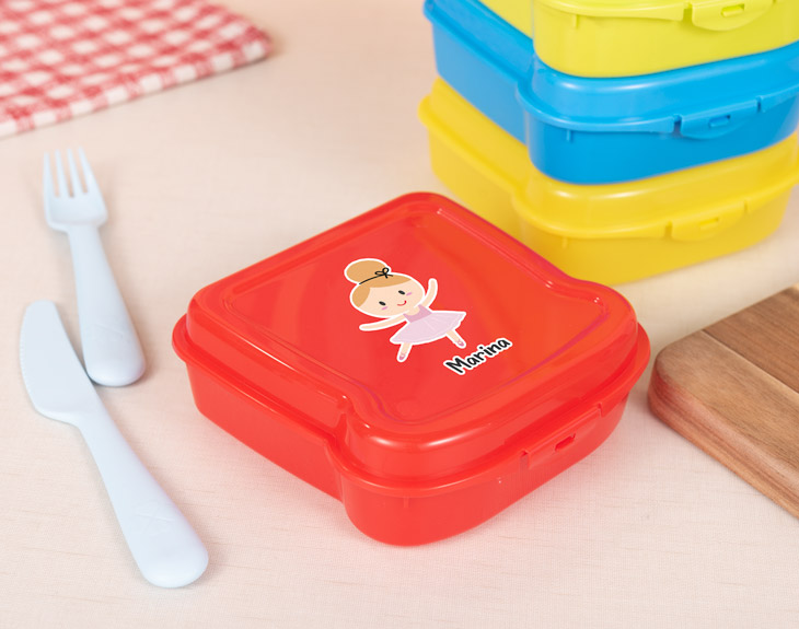 Con todas las actividades extraescolares que tendrán tus hijos, ¡van a necesitar recargar fuerzas con un buen bocata! En esas largas tardes de conservatorio o ballet, su nuevo mejor amigo será esta preciosa sandwichera personalizada. Con la forma perfectamente adaptada a ese rico sandwich de pan de molde con relleno de pavo o jamón que tanto agradecerá. ¡O rellénalo de cualquier otro snack gracias a sus 5 centímetros de alto! Le gustará tanto a sus compañeros de clase que todos querrán una. Pero para que nadie se la quite o no haya confusiones en el colegio, se incluye la personalización de la sandwichera infantil con nombre. ¡Imagina la ilusión que le hará empezar el nuevo curso con su nombre escrito debajo de esta preciosa bailarina! Ella será la encargada de cuidar sus galletas o su bocadillo con una sonrisa y una monísima posición de baile. Lo único que necesita tu niña para superar la cuesta de Septiembre es un regalo original para la vuelta al cole. Remata la sorpresa escogiendo su color favorito para el material de la lunchera personalizada. ¡No hay un complemento para el colegio más original que este! Medidas: Largo: 14cm Ancho: 14cm Alto: 5cm Material: plástico.