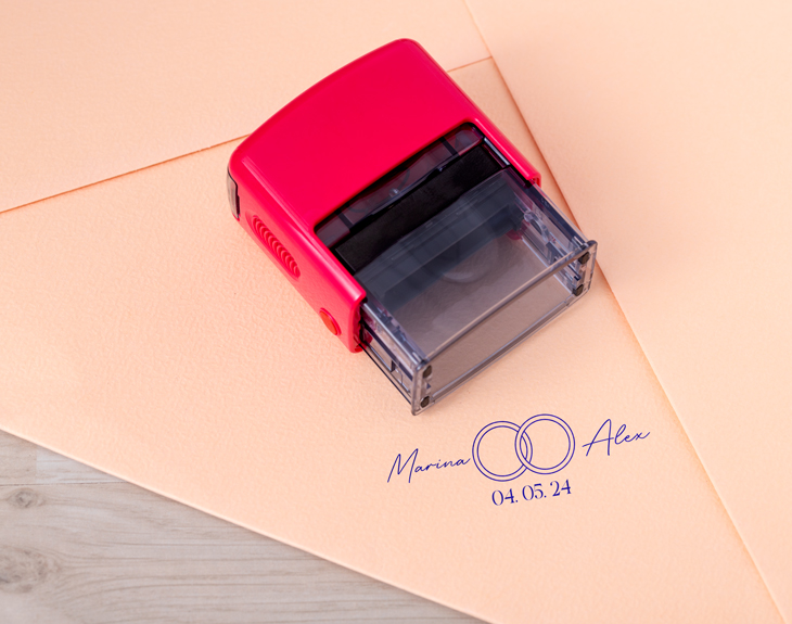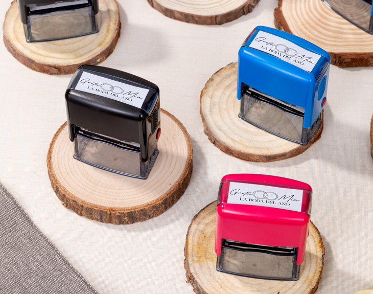 Ha llegado el día más importante de tu vida: ¡te vas a casa con el amor de tu vida! Por eso, es el momento perfecto para sorprender a todos tus invitados con estos sellos personalizados que serán un detalle único y súper divertido para el momento después de la ceremonia. Es ideal para que paséis un rato muy entretenido todos juntos y podáis customizar lo que queráis. Deja estos originales sellos en todas las mesas para que cada invitado coja el suyo, todos tendrán la misma personalización pero serán un regalo único para esta fecha tan especial. Lo mejor es que podrás elegir tanto el color del sello (rosa, azul o negro) como las unidades que quieres comprar. ¡Dejarás a todos sin palabras! No te preocupes porque personalizar estos sellos es muy sencillo. Añade el producto al carrito y entra en el área de personalización. Lo único que tienes que hacer es completar este precioso diseño de alianzas con el texto que quieras y listo. ¡Tendrás el mejor regalo del mundo para el día de tu boda! Medidas del sello: 6,5 x 5 x 3 cm. Medidas del estampado: 4 x 1,5 cm. Importante: La tinta del sello siempre es azul, independientemente del color del cabezal.