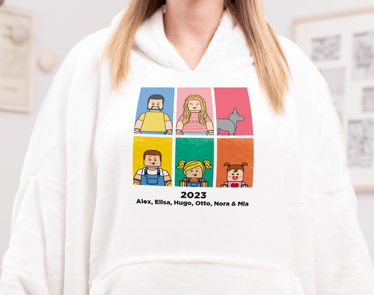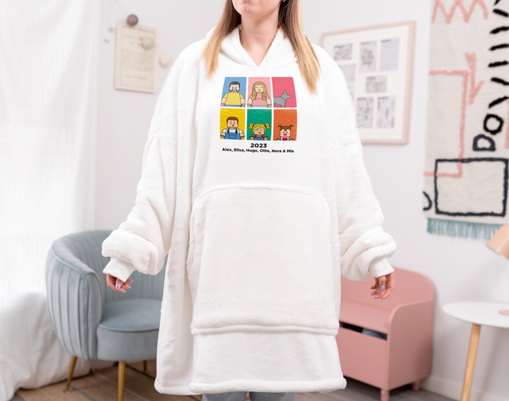 Si te encantaba quedarte en casa en las tardes de invierno jugando con tus piezas Lego, este snuggy es algo que no te puede faltar. ¡Tiene nuestro diseño Lego Pop! Además, puede ser un regalo de lo más original para esa persona que adora quedarse en casa calentito. ¡Es chulísimo! Nuestro snuggie personalizado es la mezcla perfecta entre una sudadera con capucha y una bata súper suave. Conseguirá abrigarte y mantener el calor de tu cuerpo a la perfección mientras juegas a tu videojuego favorito. ¡Es súper calentito y acogedor! Es de talla única y oversize, perfecto para abrigar y arropar todo el cuerpo, tiene el efecto de la mismísima batamanta pero en sudadera. Y lo más especial… ¡Es personalizable! Es decir, tu creas a tus propios personajes Lego Pop. Tienes para elegir entre un montón de rasgos y accesorios, seguro que encuentras los que te representen. ¡Podrás a tu propia familia Lego Pop! Para personalizarlo, el primer paso a seguir es añadir el producto al carrito y entrar al área de personalización. Una vez ahí, ya puedes crear a tu avatar desde cero. ¡Ya verás qué divertido! Este producto es de talla única. Material: poliéster. Color: blanco o negro. Medidas aproximadas: 90 centímetros de largo x 90 centímetros de ancho (de axila a axila)