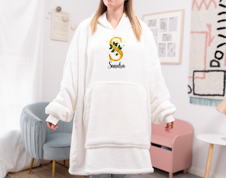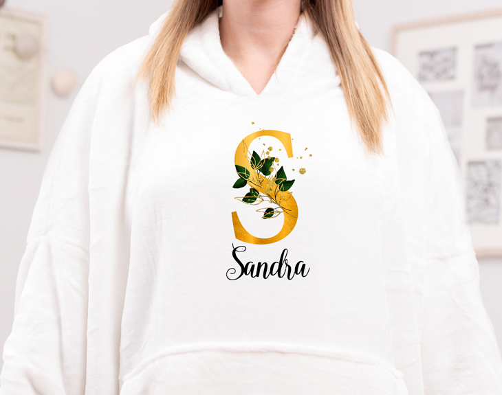 ¿A quién no le apetecería disfrutar de un día de lluvia metido en casa, bien calentito, y viendo una película en el sofá junto a tu familia? ¡Puedes completar este planazo con este snuggie personalizado oversize! Si eres de esas personas que pasan muchísimo frío con la llegada del invierno... ¡Esta batamanta personalizada es justo lo que estabas buscando! Esta fusión de manta calentita y sudadera bata con capucha hace que el snuggy con diseño de nombre sea una de las prendas más peculiares con las que puedes vestirte en casa. Hecha de 100% poliéster y de color blanco o negro, este snuggy es de talla única (cuyas medidas son de 93x94 centímetros) y es perfecto para ponérselo durante el invierno. ¿Y qué mejor regalo original para esa persona a la que siempre le gusta ir elegante por su casa que un snuggie con nuestro diseño de letras botánicas? ¡Estas iniciales son perfectas para decorar cualquier prenda! Para personalizarlo solo tendrás que entrar en el área de personalización y escoger esa letra que quieres para tu regalo, escogiendo también entre los diferentes colores disponibles. Este producto es de talla única. Material: poliéster. Color: blanco o negro. Medidas aproximadas: 90 centímetros de largo x 90 centímetros de ancho (de axila a axila)