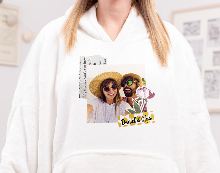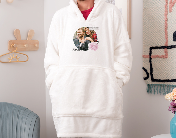 Si estás deseando que llegue el frío porque adoras los planes de quedarte en casa bien calentito, esto no puede faltar en tus planes caseros. Se trata de nuestro snuggie oversize “Recuerdos especiales”. La mezcla perfecta entre una sudadera y una bata súper suave, que conseguirá abrigarte y mantener el calor de tu cuerpo a la perfección. ¡Es súper calentito y acogedor! Si, por otro lado, conoces a esa persona que es tan casera como tú, esta sudadera tipo manta con capucha extragrande se convertirá en el regalo perfecto. Ideal para un amigo invisible, un cumpleaños o en alguna ocasión especial. Aunque, sin duda, lo mejor que tiene es que se puede personalizar con foto. Puedes elegir vuestra foto favorita o alguna que os traiga buenos momentos, así cada vez que se ponga este snuggie personalizada sonreirá y se acordará de ti. ¡Le encantará! Y te preguntarás… ¿Cómo se personaliza este producto? Es súper sencillo. Lo primero es añadir al carrito y entrar al área de personalización. Lo más difícil será elegir una sola foto de entre toda tu galería. Una vez en el diseñador, adjuntas la foto elegido y todo lo demás es cosa nuestra. Este producto es de talla única. Material: poliéster. Color: blanco o negro. Medidas aproximadas: 90 centímetros de largo x 90 centímetros de ancho (de axila a axila)