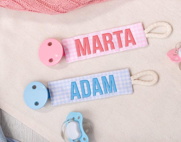Estamos todos de acuerdo en que todo recién nacido necesita tener su propio chupete, son perfectos para calmar sus berrinches y tranquilizarlos. Aunque lo malo, es que los chupetes son muy fáciles de perder, se pueden caer al suelo o ensuciarse, por eso esta cinta sujeta chupetes es perfecta para evitar que esto ocurra. ¡No esperes más y hazte con ella! Si alguien cercano a ti acaba de tener un bebé y estás pensando en tener un detalle, sin duda esta cinta sería un regalo súper especial. ¡Los padres te lo agradecerán! Además de asegurar que el chupete del pequeño esté siempre a su alcance, añadirá un toque súper adorable al outfit. La cinta es de tela con un estampado de cuadritos, tiene una pinza para sujetarlo a la ropa del bebé. Lo más especial de esta cinta, es que es personalizable. Podrás escribir el nombre del recién nacido, ¡así todos sabrán cómo se llama el pequeñín! Para personalizarlo, lo primero es añadir el producto al carrito y entrar al área de personalización. En todo momento podrás ver cómo quedará el resultado el resultado en la vista previa de nuestra web. Además, puedes elegir entre el color azul o el rosa.