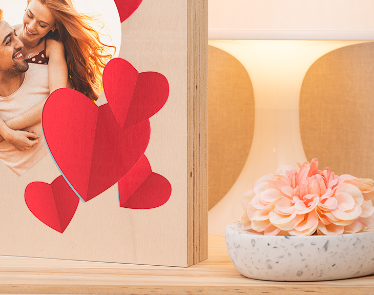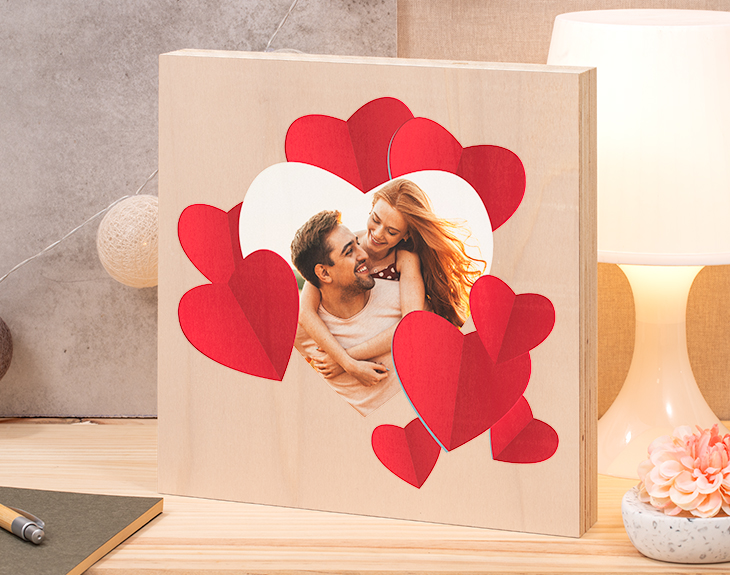 La tabla de madera personalizada más especial que existe. Vuestra fotografía favorita y alrededor corazones que representan todo vuestro amor...¿No te parece genial? Puedes sorprender a tu pareja el día de San Valentín, en vuestro aniversario o en cualquier otra fecha señalada. Imagínate su cara de sorpresa e ilusión al ver un regalo tan precioso. La forma perfecta de mantener la chispa encendida para siempre es con pequeños detalles como este. ¡Le encantará!