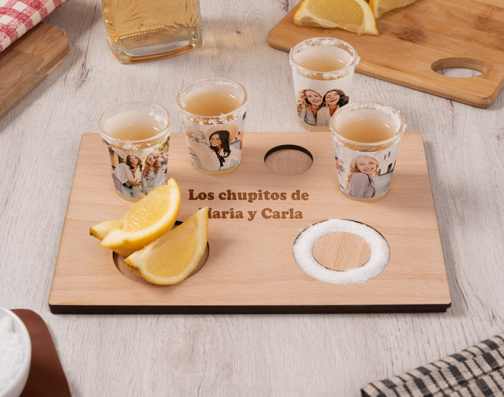 ¿Estás pensando en celebrar tu cumpleaños de la forma más loca? ¿Tienes un amigo al que le encanta disfrutar de cada momento como si fuera el último? Esta tabla de madera para chupitos personalizada será la clave para todas vuestras reuniones de amigos. ¡Una tabla donde podréis colocar los vasos después de disfrutar de esos chupitos de Tequila que tanto os gustan! El momento clave de cualquier celebración llega cuando se sacan los vasos de chupitos. ¡Por eso esta tabla para chupitos con diseño de texto es ideal para la ocasión! Esta tabla puede estar pensada para un número determinado de vasos. ¡Contamos con opciones de 2, 4 y 6 vasos de chupito! La medida de la tabla de madera cambiará dependiendo del número de vasos: si es de 2 cuenta con una medida de 18 centímetros en cada lado, mientras que las tablas de 4 y 6 cuenta con una longitud de 25,5 centímetros y una anchura de 18 centímetros. Todas las tablas cuentan con su círculo para el limón y la sal. ¡Lo tienes todo! Si tienes un amigo que nunca se pierde ni una celebración, este regalo original para fiestas está hecho para él. Además... ¡Podrás incluir los vasos de chupito correspondientes! Escoge la opción que más te guste, incluyendo o no los vasos personalizados. En el diseñador podrás personalizar la tabla con el texto y las fotos para el vaso de chupito. ¡Podrás subirlas al sistema y ajustarlas a la plantilla! Importante: Las maderas tienen vetas y estas pueden quedar reflejadas en la imagen. Medidas: 18 centímetros (2 chupitos), 25,5 x 18 centímetros (4 y 6 chupitos) Altura del vaso: 6 centímetros. Filo del vaso: 5 centímetros. Base del vaso: 3,5 centímetros.