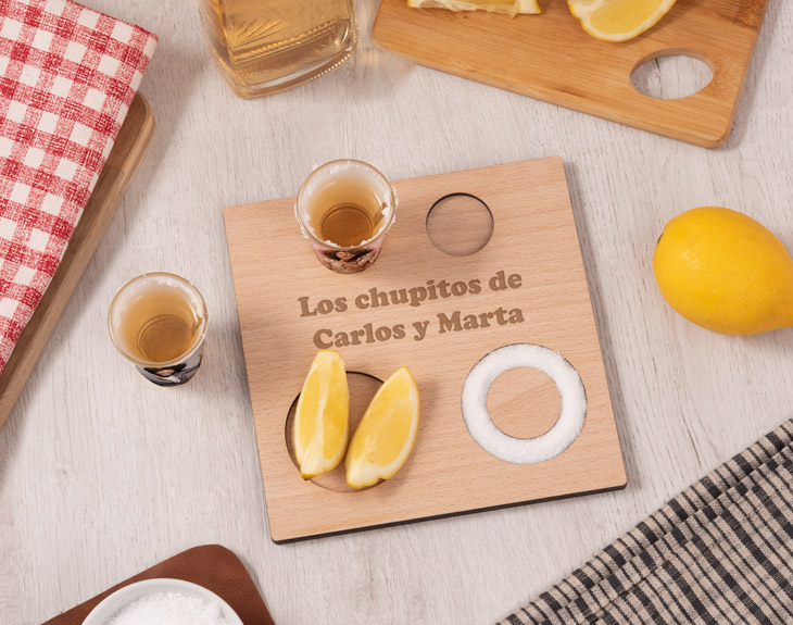• Tabla de madera para chupitos personalizada. • Tarjeta Recordatoria