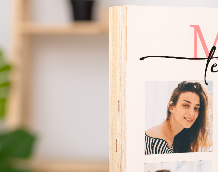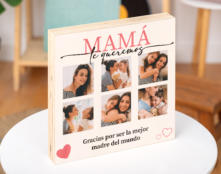 ¿Acaso hay algo más bonito que regalarle a mamá todos esos recuerdos que nunca os quitáis de la cabeza? Esta tabla de madera personalizada está hecha especialmente para esas mamis a las que les encanta volver al pasado... ¡Pero siempre de la forma más elegante! Una tabla de madera con la que vestir tu salón con vuestros mejores momentos juntos. Y es que esta tabla de madera con diseño hecho para mamá es perfecta para decirle todo lo que quieres a la mejor madre del mundo. Esta tabla de madera cuenta con una medida de 27 centímetros en cada uno de sus lados, y cuenta con un diseño hecho especialmente para esa madre tan elegante y nostálgica. ¡Seguro que se sorprenderá al ver todos esos bonitos recuerdos! Lo único que le falta a este regalo original para madres es, efectivamente, la personalización. ¡Es el momento de volcar todos esos grandes momentos! Añade el producto al carrito y accede al diseñador. Ahí encontrarás la plantilla del producto, sobre la que podrás diseñar tu maravilloso regalo. Clica sobre los cuadros de foto para subir las imágenes que quieras y clica sobre el cuadro de texto para escribir una dedicatoria bonita.