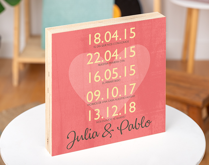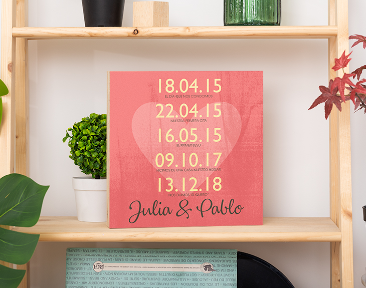 Tabla de madera personalizada con las cinco fechas más importantes de vuestra relación. ¡Las que tú elijas! Con ella, podrás decorar cualquier espacio (por ejemplo, un salón o un despacho de trabajo) y tener siempre presentes los momentos que os hacen grandes. Importante: Las maderas tienen vetas y estas quedan reflejadas en la imagen.