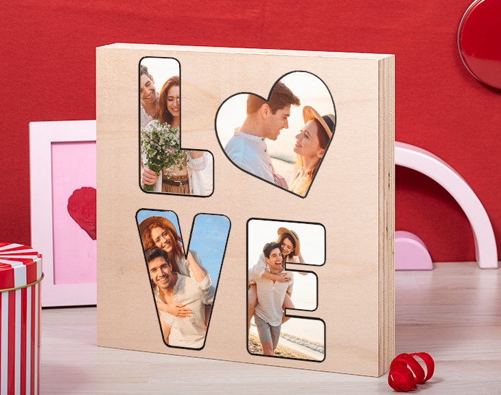 La tabla de madera personalizada perfecta para parejas en San Valentín. Es un regalo romántico para sacarle una sonrisa a tu pareja y decorar vuestro nuevo salón o habitación con la historia de amor de vuestra vida. Personaliza con cuatro fotos cada letra de la palabra LOVE. ¡Deja la foto más romántica para el corazón! Medidas de la tabla: 27 cm x 27 cm.