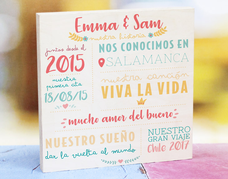 ¿Tienes una historia de amor que merece ser contada y enmarcada? Aquí tienes la solución a esta maravillosa idea. En esta tabla de madera personalizada podrás contar los mejores momentos y los más especiales vividos con tu pareja: vuestro viaje favorito, una canción que os hace sonreír, vuestra primera cita... Recordarás muchísimos momentos felices y tiernos y te ganarás un abrazo y un beso enorme cuando tu pareja reciba este regalo original. ¿Desde cuándo no le preparas una sorpresa tan especial? Este es el momento perfecto. ¡La tabla decorará vuestra casa guardando todo el amor vivido durante años de relación! Importante: Las maderas tienen vetas y estas quedan reflejadas en la imagen.