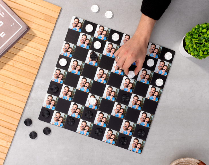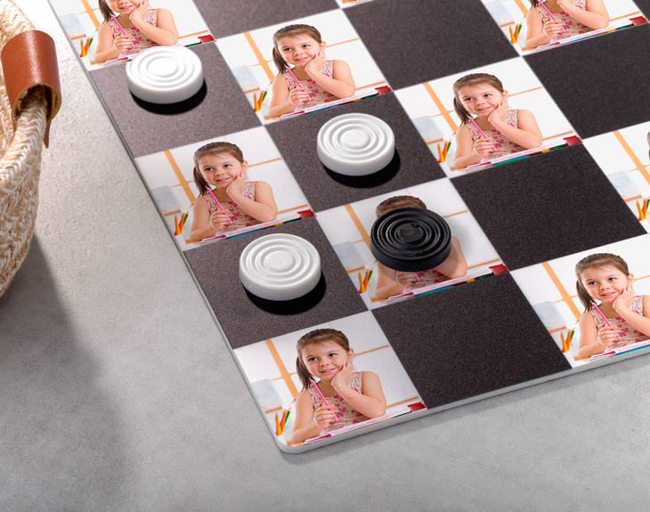 El juego de las damas más espectacular que hayas visto nunca. ¿Por qué? Porque el tablero está totalmente personalizado por ti. Escoge la foto que quieras, y la pondremos en las casillas blancas o negras, ¡tú eliges! El tablero es de metacrilato, lo que lo convierte en un juego muy especial y diferente. Regálaselo a tu hermano, a tu pareja, a tu madre o a la persona que siempre te gana en esto de las damas. ¡Le dejarás boquiabierta! El regalo incluye las fichas de las damas.