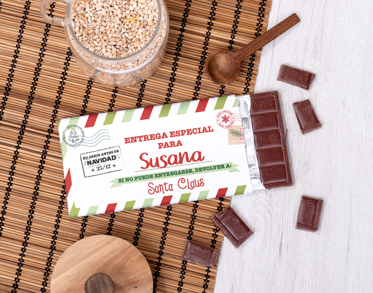 Con nuestra tableta de chocolate de elfos de Navidad podrás disfrutar de unas fiestas plenas y súper dulces. La etiqueta está diseñada para familias que están desde finales de noviembre comprando todos los dulces posibles de Navidad. ¿Tienes muchos turrones ya? Combínalos con esta tableta de chocolate tan divertida. Tienes muchos personajes para elegir, así que empieza a personalizar al completo la etiqueta. Importante: en función de los elfos que elijas, los colocaremos en distintas filas.