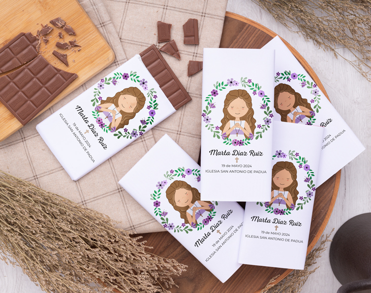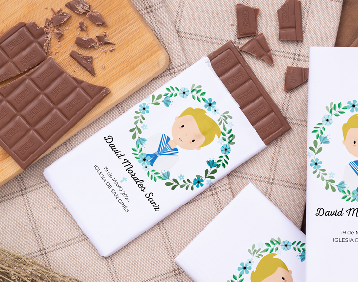 ¡Se acerca la época de las Comuniones! La Primera Comunión es una de las fechas más importantes para los niños. Además, es un día muy especial y bonito porque se juntan todos los familiares y amigos. Si quieres que todos tengan un recuerdo de esta fecha tan importante, tenemos el mejor detalle. ¡Nuestra tableta de chocolate personalizada con diseño "Flores de Comunión" es ideal! ¿Acaso hay mejor regalito que una tableta de chocolate? ¡Está claro que no, endulza a cualquiera! Sin duda, será el mejor recuerdo que les puedes ofrecer a los invitados de esta comunión. Lo mejor es que es personalizable. Podrás escribir el nombre del protagonista de este día y el lugar de la celebración. ¡Quedará genial! Personalizar esta tableta de chocolate es muy sencillo. El primer paso a seguir consiste en añadir el producto al carrito y entrar al área de personalización. Una vez ahí, ya puedes escribir el nombre del protagonista de la comunión y el lugar. Pronto estará perfecta y lista para regalar. ¡Será un original regalo para comuniones! Tienes tres tipos de chocolate: con leche, blanco o negro Chocolate negro y leche: 125 gr. Chocolate blanco: 200 gr.