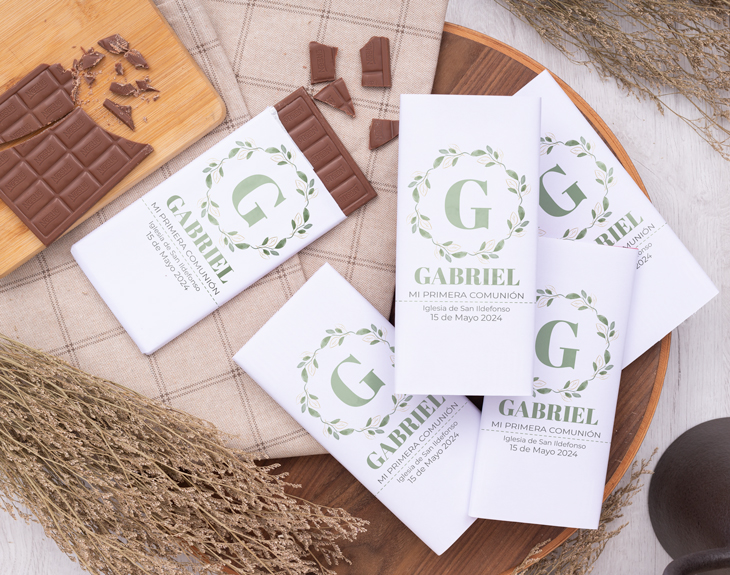 ¿Acaso hay mejor regalito que una tableta de chocolate? ¡A todos nos gusta el dulce! Está claro que si se acerca alguna fecha especial como la Primera Comunión, nuestra tableta de chocolate personalizada con diseño "Inicial con corona" se puede convertir en un recuerdo inolvidable. ¡Es genial! Sin duda, la Primera Comunión es un día muy especial para los niños, en la que se reúnen familiares y amigos. Por eso, es muy importante tener un detallito con todos lo invitados que ha hecho el esfuerzo de reunirse. Lo mejor de esta tableta es que es personalizable. Podrás escribir el nombre del protagonista de este día y el lugar de la celebración. ¡Quedará genial! Personalizar esta tableta de chocolate es muy sencillo. El primer paso a seguir consiste en añadir el producto al carrito y entrar al área de personalización. Una vez ahí, ya puedes escribir el nombre del protagonista de la comunión y el lugar. Pronto estará perfecta y lista para regalar. ¡Será un original regalo para comuniones! Tienes tres tipos de chocolate: con leche, blanco o negro Chocolate negro y leche: 125 gr. Chocolate blanco: 200 gr.