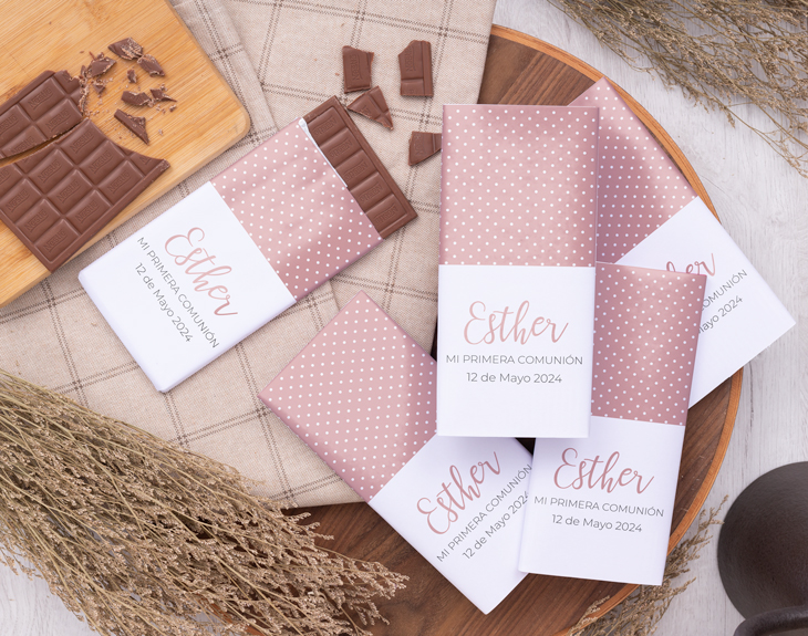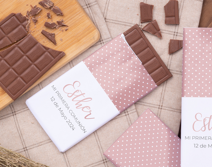 ¿Quieres ponerle el toque más dulce a la comunión de tu hijo? Sabemos que de por sí este momento ya va a ser increíblemente especial para toda la familia, pero tenemos la forma de convertirlo en algo todavía más inolvidable. ¡Estas tabletas de chocolate personalizadas serán el mejor regalo para todos los invitados a esa Primera Comunión! No hay nada como regalar un buen dulce a la gente que quieres, por lo que esta tableta de chocolate con diseño de lunares es ideal para contentar a todas esas personas que no se quieren perder este evento tan especial. ¡Podrá ir personalizado con toda la información de la celebración! Desde el nombre del protagonista hasta una dedicatoria. ¿A quién no le puede apetecer un buen trozo de chocolate después de un gran día de celebración? Este regalo original para comuniones es de lo más elegante para sacarle una sonrisa a todos los invitados de la Primera Comunión de tu hijo/a. Añade el número de tabletas que quieras al carrito para entrar en el área de personalización. Después solo tendrás que elegir el sabor del chocolate y personalizar el envoltorio con el diseño que quieras. Tienes tres tipos de chocolate: con leche, blanco o negro Chocolate negro y leche: 125 gr. Chocolate blanco: 200 gr.