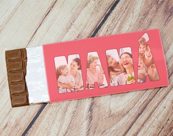 ¿Cuántas veces has pensado que tu madre es genial y que le quieres muchísimo? Ahora puedes decírselo de la manera más original: con forma de chocolate. Personalizamos el envoltorio de la tableta con este diseño tan tierno y original: escoge cuatro fotos y diseña la palabra Mamá como bien sabes. Al adquirir el producto (y antes de pagar) se te preguntará el tipo de chocolate (con leche, blanco o negro). Chocolate negro y leche: 125 gr. Chocolate blanco: 200 gr.
