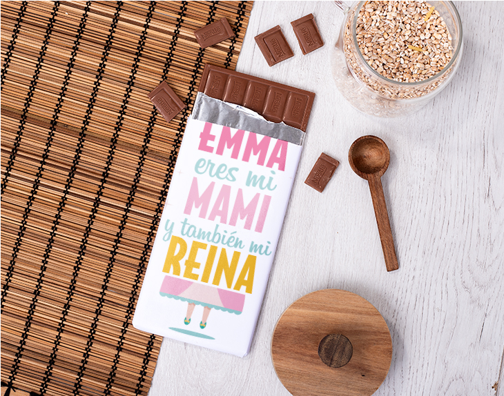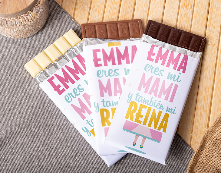 Este regalo es apto solo para los hijos que vivan con una reina en casa, con una mamá que les cuida y les mima hasta el infinito y más allá. Es un regalo espectacular para dar una sorpresa a esa madre que lucha todos los días por el bienestar de sus hijos. Elige el tipo de chocolate que quieres (con leche, blanco o negro) y personalizaremos el envoltorio con este diseño tan alegre y el nombre de tu mamá impreso en él. Aporta luz y color en el Día de la Madre con este regalazo y disfruta de la carita de emoción que pondrá tu mamá. Chocolate negro y leche: 125 gr. Chocolate blanco: 200 gr.