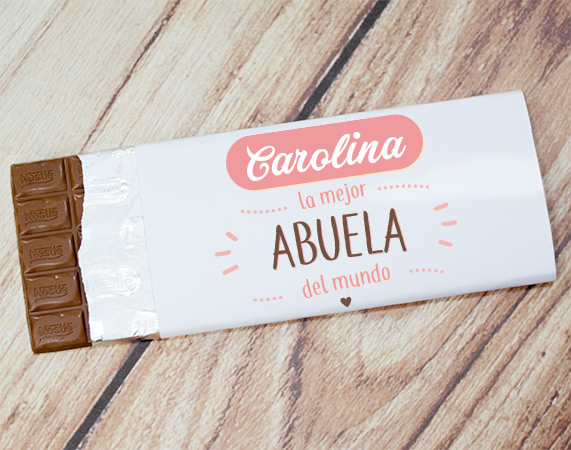 Un regalo muy dulce para la mejor abuela del mundo. Si su dulzura hace única a tu abuela, este regalo es perfecto para que su nieta favorita le saque una sonrisa. Una tableta de chocolate con su nombre impreso en la pegatina le dará a tu abuela las ganas necesarias para levantarse cada mañana. Seguro que es feliz teniendo a sus nietos al lado, y más cuando estos le hacen regalos tan dulces y divertidos. Al adquirir el producto (y antes de pagar) se te preguntará el nombre de tu niño y el tipo de chocolate que quieres (con leche, blanco o negro).