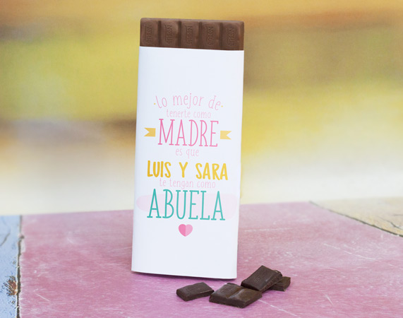 Que tu madre sea la mejor del mundo es genial, pero que además sea una fuente de alegría y diversión para tus hijos es increíble. ¿No lo piensas? Esta tableta de chocolate personalizada es perfecta para darle una sorpresa enorme a la mejor madre y abuela del mundo. Elige el tipo de chocolate que quieres (con leche, blanco o negro) y personalizaremos el envoltorio con este diseño tan alegre y el nombre de tu mamá impreso en él. Aporta luz y color en el Día de la Madre con este regalazo y disfruta de la carita de emoción que pondrá tu mamá y abuela de tus hijos. Chocolate negro y leche: 125 gr. Chocolate blanco: 200 gr.