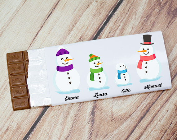 Nuestra tableta de chocolate personalizada está diseñada para disfrutar de los dulces de Navidad en familia. Si en casa gustan los turrones y todos los manjares navideños, combínalos con este chocolate tan divertido. Diseña la etiqueta al completo con nuestra familia de muñecos de nieve y haz que la Navidad sea muy diferente este año. Disponible en chocolate con leche, chocolate blanco y chocolate negro. Importante: a partir de 6 personajes irán distribuidos en dos filas. Es decir: - Familia de 6 personajes: 3 en la fila superior, y 3 en la inferior. - Familia de 7 personajes: 4 en la fila superior, y 3 en la inferior. - Familia de 8 personajes: 4 en la fila superior, y 4 en la inferior.