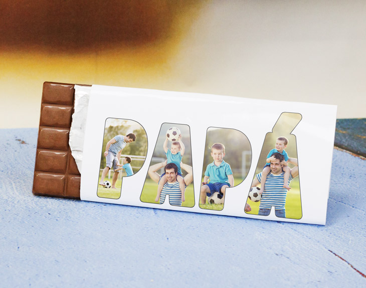 Aunque no te lo haya confesado, seguro que a tu papá también le encanta el chocolate. ¡Aprovecha el día del Padre o su cumpleaños para regalarle este dulce placer! Sorpréndele con esta tableta de chocolate personalizada con vuestros mejores momentos. Así cuando acabe de saborearla, se podrá quedar el papel de recuerdo. ¿Cuál es el sabor favorito de tu padre? Podrás elegir entre chocolate con leche, negro o blanco. Y si no se decide, ¡puedes llevarte dos distintas! Cada una con su personalización y sabor distinta. O 20 todas iguales para repartir a todo el mundo. Convierte este detalle tan dulce en un emotivo regalo original para padres. Añade hasta cuatro fotos, una en cada letra, y mira lo bien que quedan todas juntas bajo la silueta de "PAPÁ". Chocolate negro y leche: 125 gr. Chocolate blanco: 200 gr.