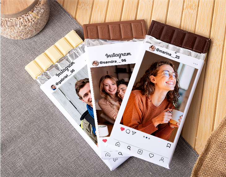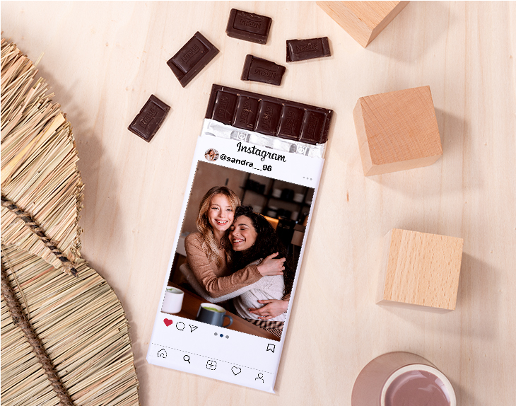 ¿Qué te parecería hacerle el regalo más dulce a esa persona que no puede dejar de subir fotos a Instagram? ¡Haz que salga de su burbuja y que disfrute de los buenos momentos gracias a esta tableta de chocolate personalizada! Un delicioso chocolate con el que celebrar vuestros momentos más especiales. Esta tableta está pensada para darle una sorpresa de lo más romántica a tu pareja, incluyendo ese recuerdo tan único al que siempre volvéis en vuestras cabezas. Esta tableta puede ser de chocolate con leche, negro o blanco, dependiendo de lo que prefieras para esa persona tan especial. El chocolate con leche y negro es de 125 gramos mientras que el blanco es de 200 gramos. ¡No os podréis resistir! ¿Por qué subir una foto a tu perfil de Instagram cuando puedes hacerlo en este regalo original tan personal? ¡Crea tu propio post como si estuvieras en la aplicación! En el área de personalización podrás crear el diseño que quieras, clicando sobre cada uno de los cuadros de texto o imagen que encuentres. ¡Podrás personalizar desde la foto del perfil del post como la el texto debajo de la foto principal! Crea el momento más dulce para esa ocasión especial gracias a esta tableta de chocolate.