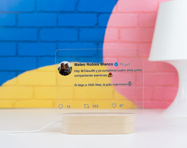 ¿Cuántas horas al día pasamos en las redes sociales? ¿Cuál es tu favorita? Sabemos que hay muchas, pero siempre hay una en la que pasas más tiempo y no puedes parar de cotillear dentro de ella. A todos nos pasa, no te preocupes. En el caso de que tú no seas la persona adicta a las redes sociales, seguro que conoces a alguien que sí que lo sea y no pare de saltar de una aplicación a otra, ¿a que sí? Pues tenemos el regalo perfecto para esa persona que vive dentro de Twitter y no deja de refrescar la página principal para ver si hay nuevos tuits, nuestra tableta de chocolate personalizada en la que podrás añadir un tuit con todos sus detalles, como si fuese uno de verdad. Seguro que la persona que reciba esta tableta se quedará muy sorprendida, porque es un regalo de lo más original y además, riquísimo. No podrá resistirse a este delicioso chocolate. Además, podrás elegir entre qué chocolate quieres: chocolate con leche, negro y blanco. Pensado para todos los gustos. Y cuando la tableta se acabe, podrá quedarse con el papel personalizado y así acordarse siempre de ti. ¡No hay regalo más bonito! Y lo mejor de este producto es que podrás personalizar esta tableta totalmente a medida. Añade el producto al carrito y pulsa el botón de personalizar para comenzar a diseñar tu propio tuit: foto de perfil, usuario, fecha y texto como un tuit de verdad. Ya solo queda disfrutar de esta tableta en compañía... o no. Chocolate negro y leche: 125 gr. Chocolate blanco: 200 gr.