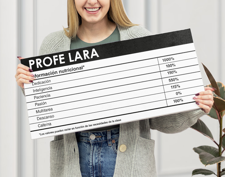 ¡El mejor profe del universo existe y es el tuyo! Seguro que durante este curso lo ha dado todo, os ha enseñado un montón de cosas, ha tenido toda la paciencia del mundo con sus alumnos y ha conseguido que os encante su asignatura. Por todo esto y más, vuestro profe se merece el regalo más guay y dulce que hay: ¡una tableta gigante personalizada! Si es amante del chocolate y de los regalos únicos, esta tableta es perfecta. Gracias a este regalo, tendrá un montón de tabletas de su chocolate favorito y podrá disfrutarlo cuando quiera. ¡Siempre se acordará de sus alumnos por este detalle! Esta original tableta está hecha para que a ningún profe se le olvide todo lo que tiene que tener para ser el mejor y todo un referente para su clase. Esta tableta cuenta con una caja de cartón de 58 x 28 centímetros y en su interior, muchas tabletas de su chocolate favorito: Kinder, Kit Kat, Huesitos, Jungly, Valor, Lindt... ¡Hay para todos los gustos! Personalizar esta tableta gigante para tu profe es muy fácil. Elige el relleno que quieres y añade el producto al carrito. Entra en el área de personalización y escribe el nombre de tu profe en esta divertida tabla de información nutricional especial para profes. ¡No habrá regalo más guay y dulce que este! Medidas de la tableta gigante: 58 x 28 centímetros. Elige una opción de relleno: • 28 barritas de Huesitos. • 6 tabletas de Jungly. • 9 tabletas de Nestlé Dolca. • 9 tabletas de Milka (surtido): chocolate, chocolate blanco, Chips Ahoy y Oreo. • 15 paquetes de Kit Kat. • 5 tabletas de Valor (surtido) • 9 tabletas de chocolates Lindt (surtido): Figue Intense, Limón, Miel y Almendras, Caramel, Mango y Almond, Chili, Sésamo y Strawberry Intense.