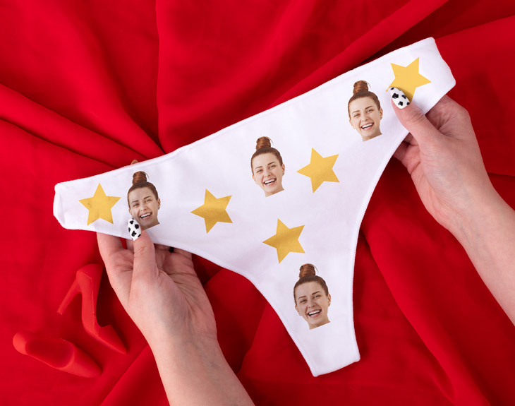 No importa si llevas mucho o poco tiempo con tu pareja, lo más importante para durar muchos años es mantener siempre la llama encendida. ¿Y cómo puedes conseguir eso? Pues con un regalo tan atrevido y diferente como este tanga personalizado. Deja a tu novia sin palabras con este detalle tan sexy y perfecto para vuestra velada más romántica. Estamos seguros de que le encantará tener una prenda de ropa interior tan especial como esta y hecha totalmente a media. ¡Es genial! Si os encanta regalaros cosas diferentes y fuera de lo común, este original tanga será un acierto seguro. Os encantará disfrutarlo en vuestros momentos más íntimos de pareja porque es único. Pero no solo puede ser el regalo ideal para San Valentín o vuestro aniversario, también es genial para una despedida de soltera, para una boda o para un amigo invisible. Vale para cualquier situación porque es un regalo divertido y diferente. Hazle a tu pareja el regalo más sexy del mundo y personaliza este tanga para que sea súper guay. Añade el producto al carrito y entra en el área de personalización. Ahí, podrás completar este diseño de estrellitas con la imagen que quieras. Una vez hecho esto, solo queda disfrutar de este regalo los dos juntos. ¡Os encantará! Medidas: 30 x 21,5. Talla: S, única. Material: algodón natural. Importante: se puede meter en la lavadora a una temperatura máxima de 30 grados. No es recomendado usar lejía ni secarlo en la secadora.
