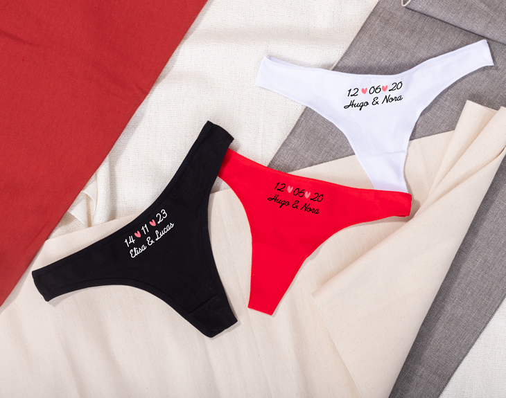 Si quieres disfrutar de una noche íntima e inolvidable con tu pareja, este tanga personalizado es el regalo perfecto para vuestra velada más romántica. No hay mejor manera de mantener la llama encendida en vuestra relación que con este detalle tan atrevido para pasarlo genial los dos juntos. Sorprende a tu novia con la prenda más sexy del mundo. ¡Le encantará! Si aún recuerdas el día de vuestro primer beso o la fecha exacta en la que os visteis por primera vez, podrás plasmar vuestra fecha más especial en este original tanga y sorprender a tu novia en cualquier ocasión. Deja atrás los regalos aburridos y típicos y triunfa en San Valentín o en vuestro aniversario con este detalle tan diferente. Ideal para las parejas más juguetonas. ¡Será un recuerdo único! Este detallito es perfecto para cualquier ocasión... Pero no te puedes olvidar de personalizar este tanga para que sea aún más especial. Añade el producto al carrito y entra en el área de personalización. Ahí, podrás completar el diseño con vuestra fecha más importante y vuestros nombres o el texto que quieras. ¡Quedará genial y listo para disfrutarlo! Medidas: 30 x 17,5. Talla: S, única. Material: algodón natural. Importante: se puede meter en la lavadora a una temperatura máxima de 30 grados. No es recomendado usar lejía ni secarlo en la secadora.