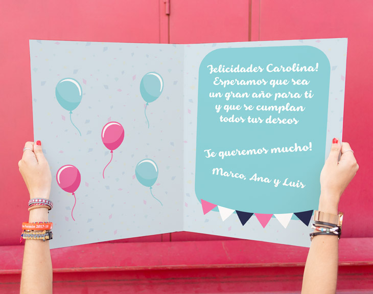 ¿Además de la fiesta que le estáis preparando queréis comprarle una tarjeta muy especial para desearle entre todos un feliz cumpleaños?¡Nuestra tarjeta gigante personalizada es una opción increíble! Y es que, así podrá llevarse un recuerdo precioso de este día tan especial. Así todo el mundo podrá ponerle una dedicatoria...¡Seguro que se emociona muchísimo al ver todo lo que le quieren sus familiares y amigos! Podéis escoger la opción de personalizar únicamente el exterior de la tarjeta y así escribir a mano el mensaje que queráis o personalizar también el interior con la ayuda de nuestro diseñador. ¡Así podrás escoger la tipografía, el color o la foto que quieras!¡De esta manera estará listo para entregar! ¿Cómo se graba el mensaje? ¡Es muy fácil! Añade la tarjeta al carrito y dale al botón de "personalizar". Podrás grabar un mensaje en ese momento (con el micro del móvil o del ordenador) que nosotros nos encargaremos de incluir la tarjeta. ¡El único límite es tu imaginación! ¿Cómo se graba el mensaje? ¡Es muy fácil! Añade la tarjeta al carrito y dale al botón de "personalizar". Podrás grabar un mensaje en ese momento (con el micro del móvil o del ordenador) que nosotros nos encargaremos de incluir la tarjeta. ¡El único límite es tu imaginación! Medidas (tarjeta abierta): Tarjeta gigante: 66 x 44 cm Tarjeta A4: 42 x 29'50 cm Importante: a la hora de escribir el texto en el interior de la tarjeta, necesitarás darle al botón "ENTER" para crear diferentes párrafos. En el caso de escribirlo todo seguido, el texto irá todo en una línea, y el diseño saldrá tal y como le llegue a nuestro equipo de personalización.