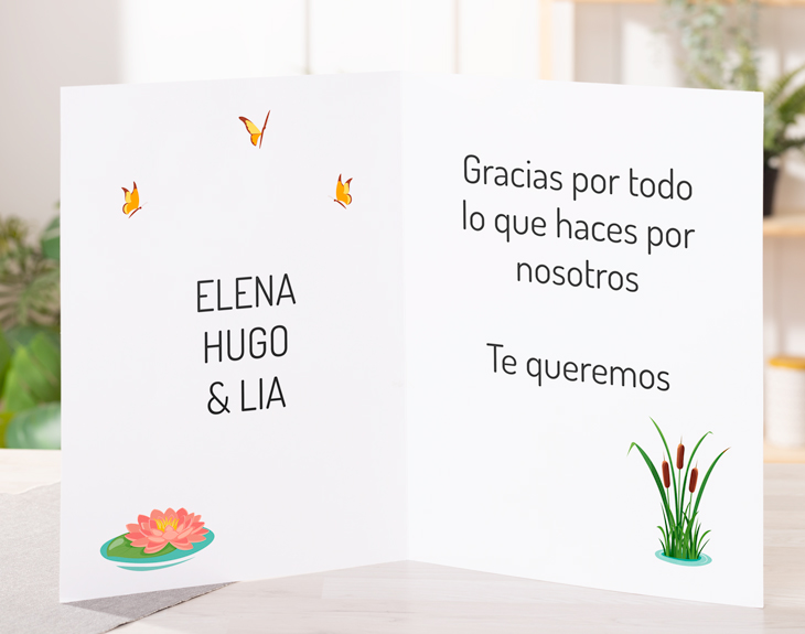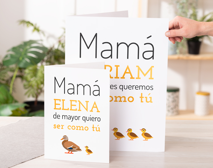 Se acerca el Día de la Madre y esta tarjeta personalizada es el detalle perfecto para emocionarla. Un regalo original, lleno de cariño y con un mensaje que llega al corazón. Gracias a su diseño “Mamá, de mayor quiero ser como tú”, podrás decirle lo mucho que significa para ti. Es un regalo especial, ideal para darle las gracias por todo lo que hace por vosotros. Puedes elegir entre dos tamaños: A4 o gigante. Además, podrás personalizar tanto el exterior como el interior de esta tarjeta tan especial. Piensa bien qué mensaje quieres dedicarle... ¡seguro que le encantará! ¿Cómo se personaliza? Es muy sencillo. Solo tienes que añadir la tarjeta al carrito y acceder al área de personalización. Según la opción que elijas, podrás personalizar solo la portada o también el interior. ¡Tú decides cómo hacerla única para ella! Sin duda, será un regalo original para la mejor mamá del mundo. Medidas (tarjeta abierta): Tarjeta gigante: 66 x 44 cm Tarjeta A4: 42 x 29,5 cm Importante: Al escribir el mensaje interior, pulsa la tecla “ENTER” para separar los párrafos. Si escribes todo seguido, el texto aparecerá en una sola línea, y se imprimirá tal como llegue al equipo de personalización.