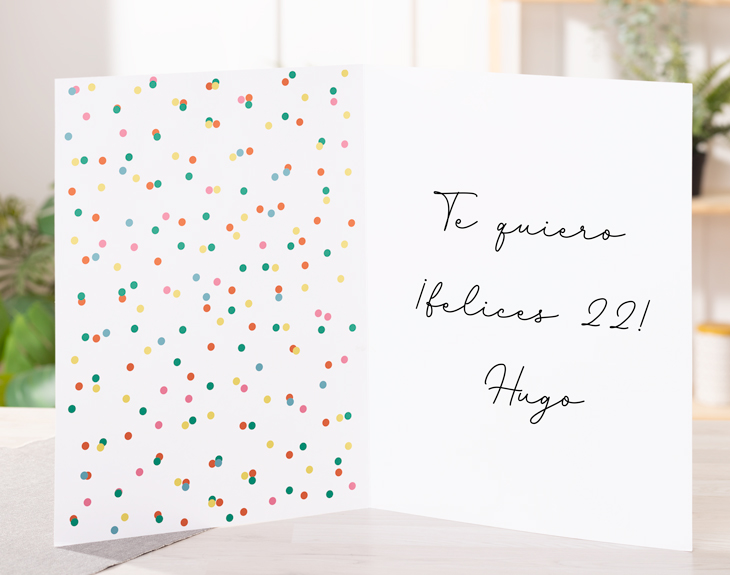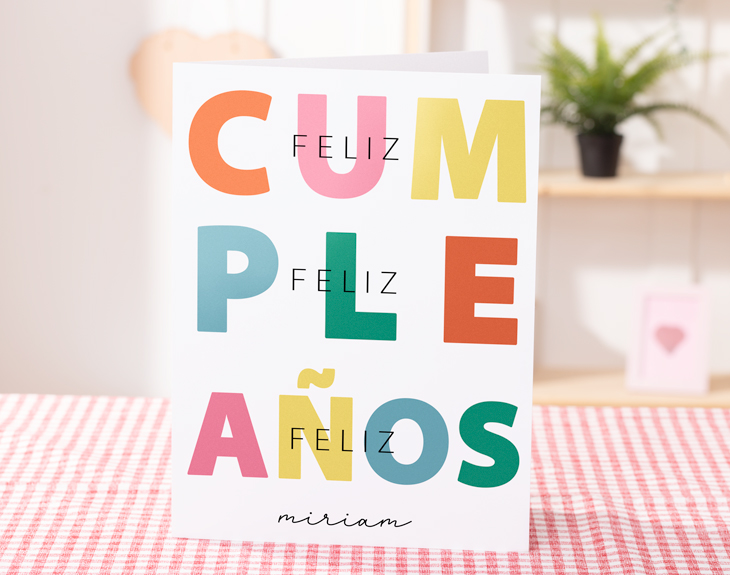 Seguro que quieres sorprende de la manera más original a alguien que dentro de poco cumple años, ¿verdad? Pues no te preocupes porque tenemos el detalle perfecto y es esta preciosa tarjeta personalizada. Si quieres diferenciarte del resto de personas y dejar a un lado las típicas tarjetas, esta es la mejor opción. ¡Se quedará sin palabras! Sin duda, esta original tarjeta es perfecta para felicitar el cumple a esa persona que tanto quieres, ya que puedes ser tanto un detallito individual como de muchas personas. Su diseño lleno de colores es genial, porque llamará la atención de todo el mundo y esta tarjeta no pasará desapercibida. Además, podrás elegir que opción te gusta más: personalizar solo el exterior de la tarjeta o añadir también algo en el interior. ¡Es lo más! Y llega el mejor momento que es personalizar la tarjeta para que sea única. Elige qué tipo de personalización quieres y deja volar tu imaginación. Añade su nombre, los años que cumple o una breve dedicatoria que le haga emocionarse cuando la lea. ¡Será el mejor regalo del mundo! Medidas (tarjeta abierta): Tarjeta gigante: 66 x 44 cm. Tarjeta A4: 42 x 29'50 cm. Importante: a la hora de escribir el texto en el interior de la tarjeta, necesitarás darle al botón "ENTER" para crear diferentes párrafos. En el caso de escribirlo todo seguido, el texto irá todo en una línea, y el diseño saldrá tal y como le llegue a nuestro equipo de personalización.