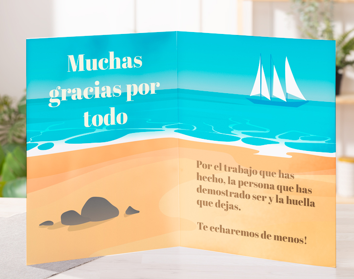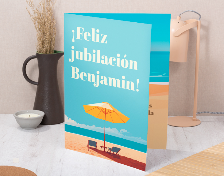 ¿Conoces a alguien que pronto disfrutará de su merecida jubilación? Esta tarjeta personalizada con temática de playa es la forma perfecta de celebrarlo. Su diseño lleno de sol, arena, un velero y tonos cálidos transmite todo lo bueno que le espera, descanso, libertad y quizás unos cuantos cócteles frente al mar. Es el regalo de jubilación ideal para cualquier compañero de trabajo o familiar. Con una ilustración veraniega y llena de buen rollo, esta tarjeta es perfecta para despedirse con cariño y desearle una nueva etapa tan maravillosa como merecida. Además, en el interior podrás escribir un mensaje súper bonito y emotivo que, sin duda, le sacará una gran sonrisa. Y lo mejor de todo, es totalmente personalizable. Elige el tamaño que prefieras, con interior en blanco o con diseño personalizado. Tú decides. Solo tienes que indicarnos su nombre, una frase especial y un mensaje tierno. Nosotros nos encargamos del resto para que el diseño sea único y especial. Seguro que, al verla, sentirá que su nueva vida comienza de la mejor manera posible. Porque, después de tanto trabajar, se merece descansar pero sin olvidarse de ti. Medidas (tarjeta abierta): Tarjeta gigante: 66 x 44 cm. Tarjeta A4: 42 x 29'50 cm. Importante: a la hora de escribir el texto en el interior de la tarjeta, necesitarás darle al botón "ENTER" para crear diferentes párrafos. En el caso de escribirlo todo seguido, el texto irá todo en una línea, y el diseño saldrá tal y como le llegue a nuestro equipo de personalización.