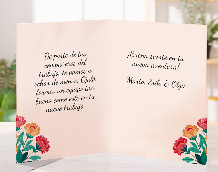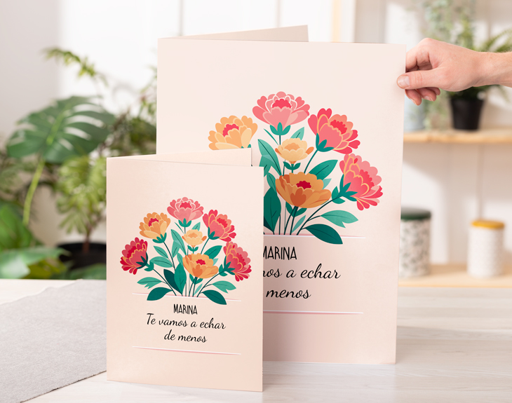 No hay mejor manera de enviarle un mensaje a alguien que con esta preciosa y emotiva tarjeta personalizada. Es perfecta para cualquier ocasión: si tienes que despedirte de alguien, si quieres darle la enhorabuena, felicitarle por su cumpleaños, desearle buena suerte para un futuro proyecto... ¡Nadie tendrá un atarjeta tan original como esta! Aprovecha cualquier ocasión para poder regalar una tarjeta como esta y triunfar con la persona que la reciba, porque se quedará sin palabras. Y es que además de personalizarla, podrás elegir las medidas de tu tarjeta: tamaño A4 o gigante. No importa cuál escojas porque ambas son súper chulas. ¡Y su diseño mucho más! Y no te preocupes porque personalizar esta tarjeta es muy fácil. Elige la opción y añadéla al carrito. Desde nuestro diseñador podrás seleccionar si personalizas el exterior de la tarjeta o añades también la opción del interior. Podrás escribir lo que quieras y nosotros nos encargamos del resto. ¡será un regalo genial! Medidas (tarjeta abierta): Tarjeta gigante: 66 x 44 cm Tarjeta A4: 42 x 29,50 cm Importante: Al escribir el mensaje en el interior, recuerda darle al botón "ENTER" para crear párrafos. Si lo escribes todo seguido, el texto aparecerá en una sola línea, y el diseño se ajustará tal como lo hayas ingresado.