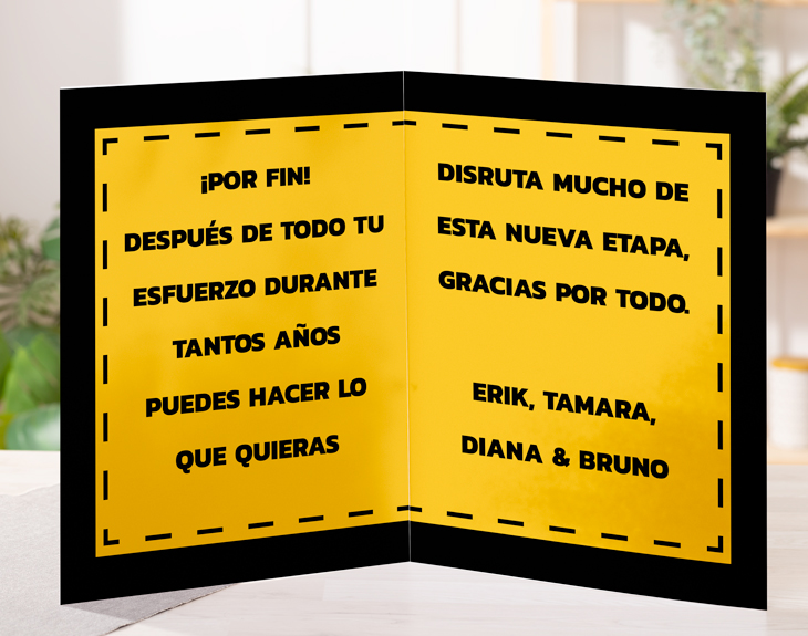 ¿Acaba de jubilarse esa persona tan especial? ¿Quieres sorprenderla con un detalle único para celebrar el inicio de esta nueva etapa? No te preocupes, porque tenemos el regalo perfecto para este momento tan importante: nuestra tarjeta personalizada. Es ideal para agradecer todo lo vivido y desearle lo mejor en esta nueva etapa. Olvídate de los regalos típicos y déjale sin palabras con esta original tarjeta. Además, podrás elegir el tamaño que más te guste según sus preferencias: A4 o tamaño gigante. El formato A4 es el estándar, como un folio, y el gigante es un auténtico acierto para destacar en cualquier celebración. También podrás decidir si quieres personalizar solo el exterior o toda la tarjeta, tanto por dentro como por fuera. ¡Cualquier opción quedará genial! Ahora llega el momento de personalizar esta tarjeta para convertirla en un regalo de jubilación único y lleno de significado. Elige la opción que mejor encaje contigo y añádela al carrito. Después, accede al área de personalización y rellena los cuadros de texto con una dedicatoria especial, fechas importantes o cualquier mensaje que quieras transmitir. Una vez terminado, tu tarjeta estará lista para emocionar y acompañar ese merecido homenaje. Medidas (tarjeta abierta): Tarjeta gigante: 66 x 44 cm. Tarjeta A4: 42 x 29'50 cm. Importante: a la hora de escribir el texto en el interior de la tarjeta, necesitarás darle al botón "ENTER" para crear diferentes párrafos. En el caso de escribirlo todo seguido, el texto irá todo en una línea, y el diseño saldrá tal y como le llegue a nuestro equipo de personalización.