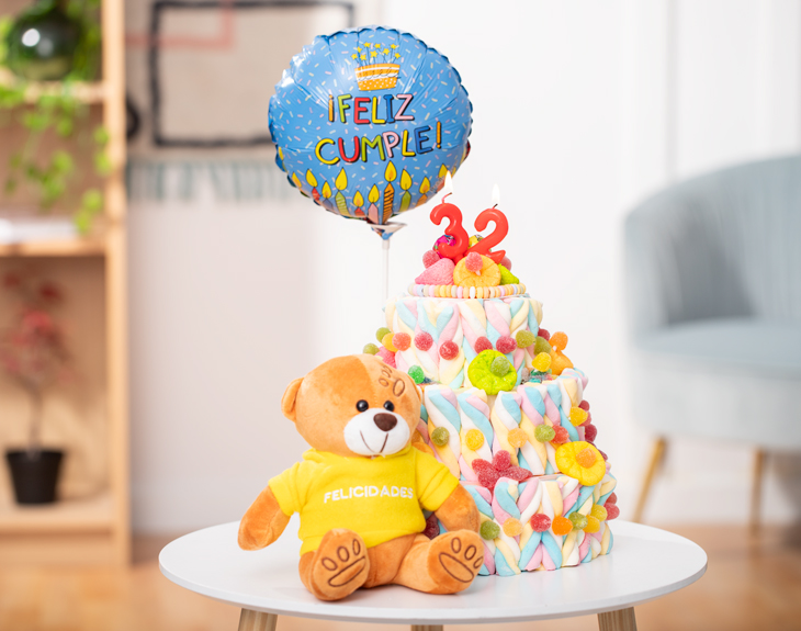 • Tarta de Golosinas (1kg). • Velitas. • Oso con mensaje (opcional). • Globo "Feliz Cumple" (opcional). • Tarjeta Recordatoria.