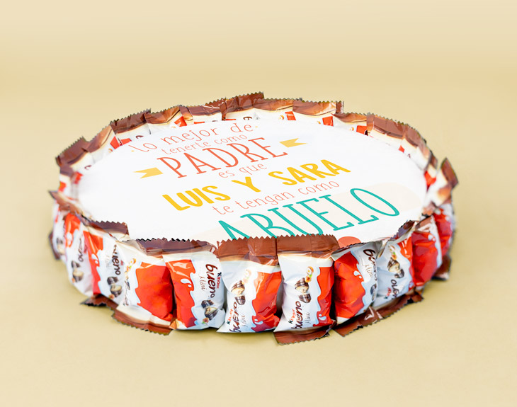 ¿Qué mejor manera de celebrar el Día del padre que con una buena ración de dulce? El chocolate es el mejor ingrediente para convertir una celebración en todo un éxito. ¿A quién no le puede gustar este manjar de los dioses? Seguro que a toda la familia le encanta. Queremos que tengáis un día impresionante, por eso tenemos este pack redondo de chocolatinas personalizado. El Día del padre no existe solo para celebrar lo bueno que es tu padre. Los abuelos son muy importantes, y de hecho se merecen un regalazo por tu parte. ¿Qué mejor manera de agradecerle todo lo bueno que ha sido como padre y como abuelo que con una tarta repleta de chocolatinas? Endúlzale la vida y emociónale con este impresionante regalo. Esta tarta está hecha de poliespán, es de 26x26cm, y tiene las chocolatinas pegadas en los laterales. Y tenemos una sorpresa más: podrás elegir el chocolate que más le guste. ¿Este abuelo perfecto es más de Kinder, Kinder bueno, o Toblerone? Elige el más indicado para la ocasión y personaliza este regalo original para el Día del padre. Medidas: 26 cm x 26 cm. Material: poliespán, con las chocolatinas pegadas en los laterales. Número de chocolatinas: 44 Kinder / 32 Kinder bueno mini / 25 Toblerone mini.
