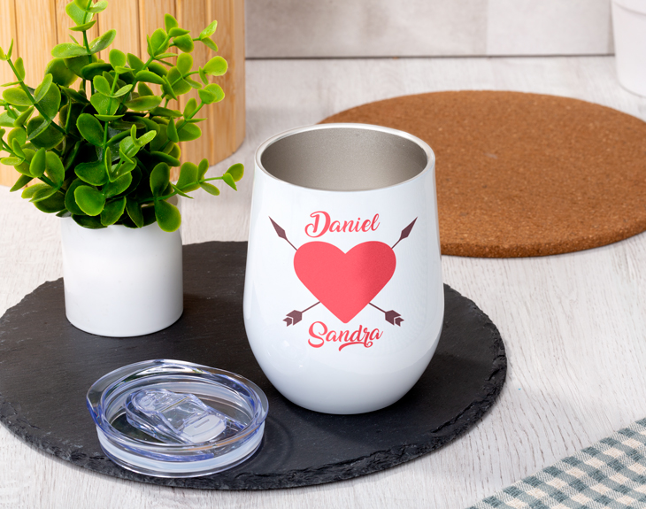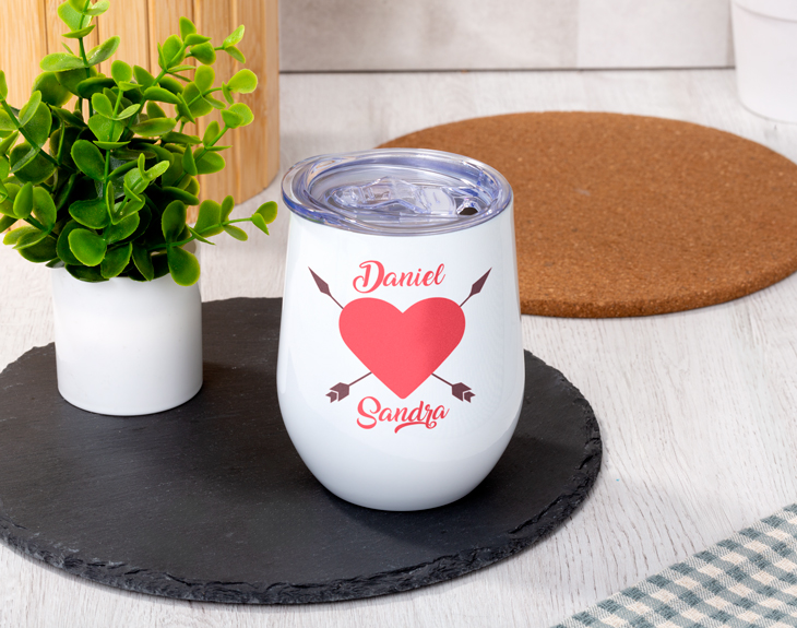 ¿Tú también sientes ese calorcito en el pecho cuando estás con la persona que amas? Pocas cosas en el mundo hay comparables a esa sensación. Quizá una de las pocas cosas que puede emularlo es estar plenamente relajado tomándote tu bebida favorita igual de calentita. No pierdas el calor ni ese sentimiento con esta taza térmica personalizada. Así podrás tener siempre cualquier líquido a la temperatura fija que quieras y recordar tu amor por tu pareja con este diseño romántico de corazón y flechas. Al poder llevarte dos vasos en pack con un precio más barato que comprándolos por separado, te sirven como un regalo original y práctico para San Valentín o vuestro aniversario. Sorprende a novio/a con esta taza blanca personalizada con nombre a color. Al tener dos espacios de textos para escribir libremente, puedes tener a todo color sobre la pared de acero inoxidable vuestros dos nombres o los apodos cariñosos con los que siempre os llamáis. ¡Que vuestro amor dure tanto como la temperatura de la bebida que guardes! Lleva tu amor y este vaso ovalado personalizado cómodamente a cualquier lugar donde más necesites la bebida caliente: de excursión, en la oficina... Es fácilmente transportable gracias a su cierre hermético de plástico con una única apertura para la boquilla. Altura: 12 centímetros. Base: 5,5 centímetros. Borde: 8 centímetros. Capacidad: 360 mililitros. Material: acero inoxidable. Color: blanco. Medidas de la tapa: 7,5 x 8 centímetros. Material de la tapa: plástico reforzado, cerrado a presión. Incluye doble pared. Importante: incluye tapa transparente con boquilla.